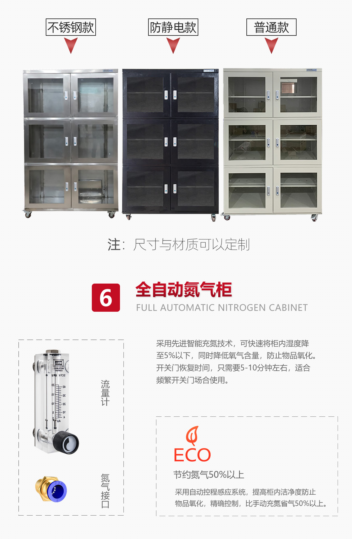 節能氮氣柜是利用氮氣來達到防氧化防潮目的柜體,氮氣柜i具有送氮和排氣的通路這種控制方式,可真正做到對內部含氧量的控制,有目的起到防氧化功能,同時也有更高的節氮功能。被廣泛應用在微電子,半導體,新能源,國防,軍工行業的研發生產工序,用于各類貴金屬材料,半導體器件和敏感器件的防氧化保存。